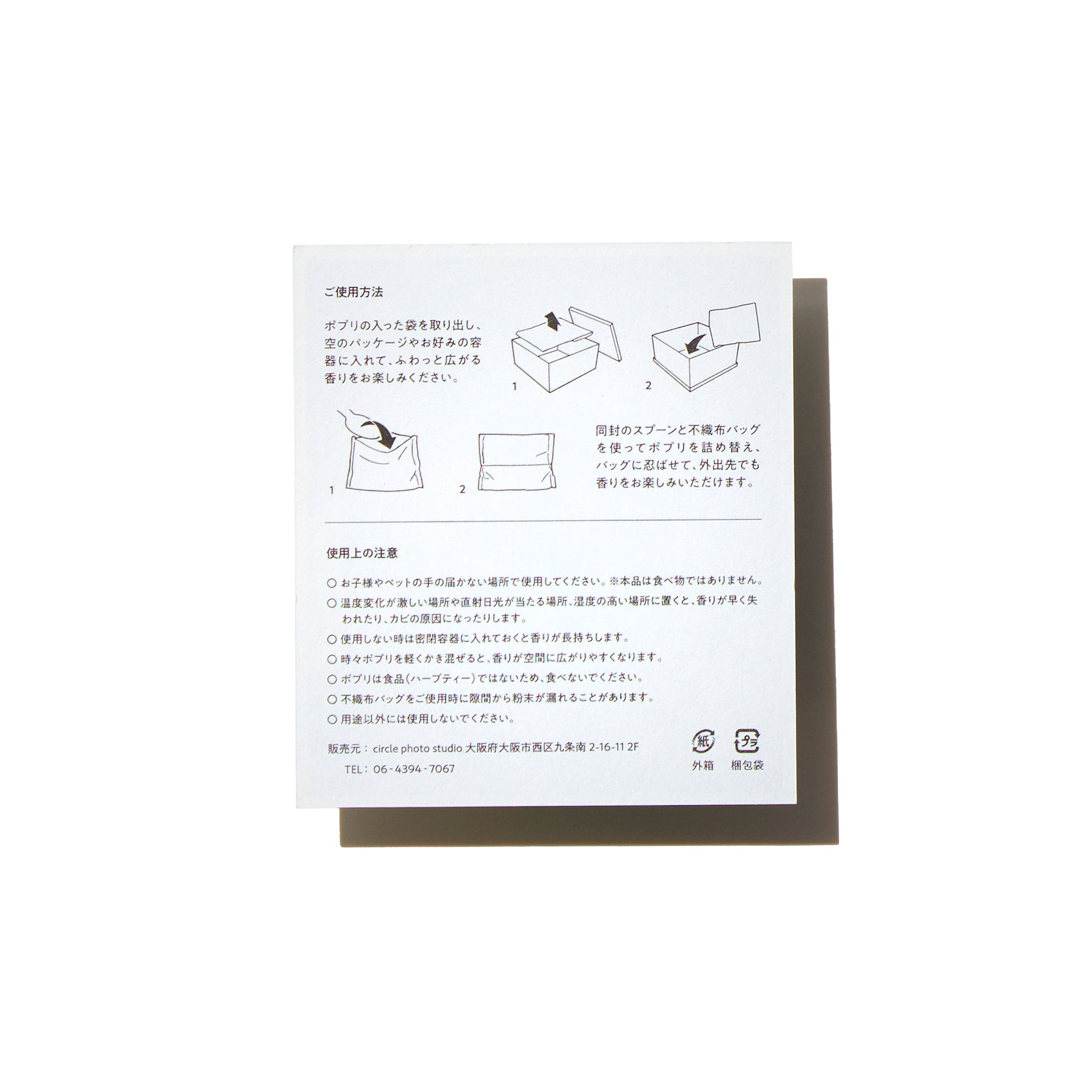 同封のスプーンと不織布バッグを使ってポプリを詰め替え、バッグに忍ばせて、外出先でも香りをお楽しみいただけます。